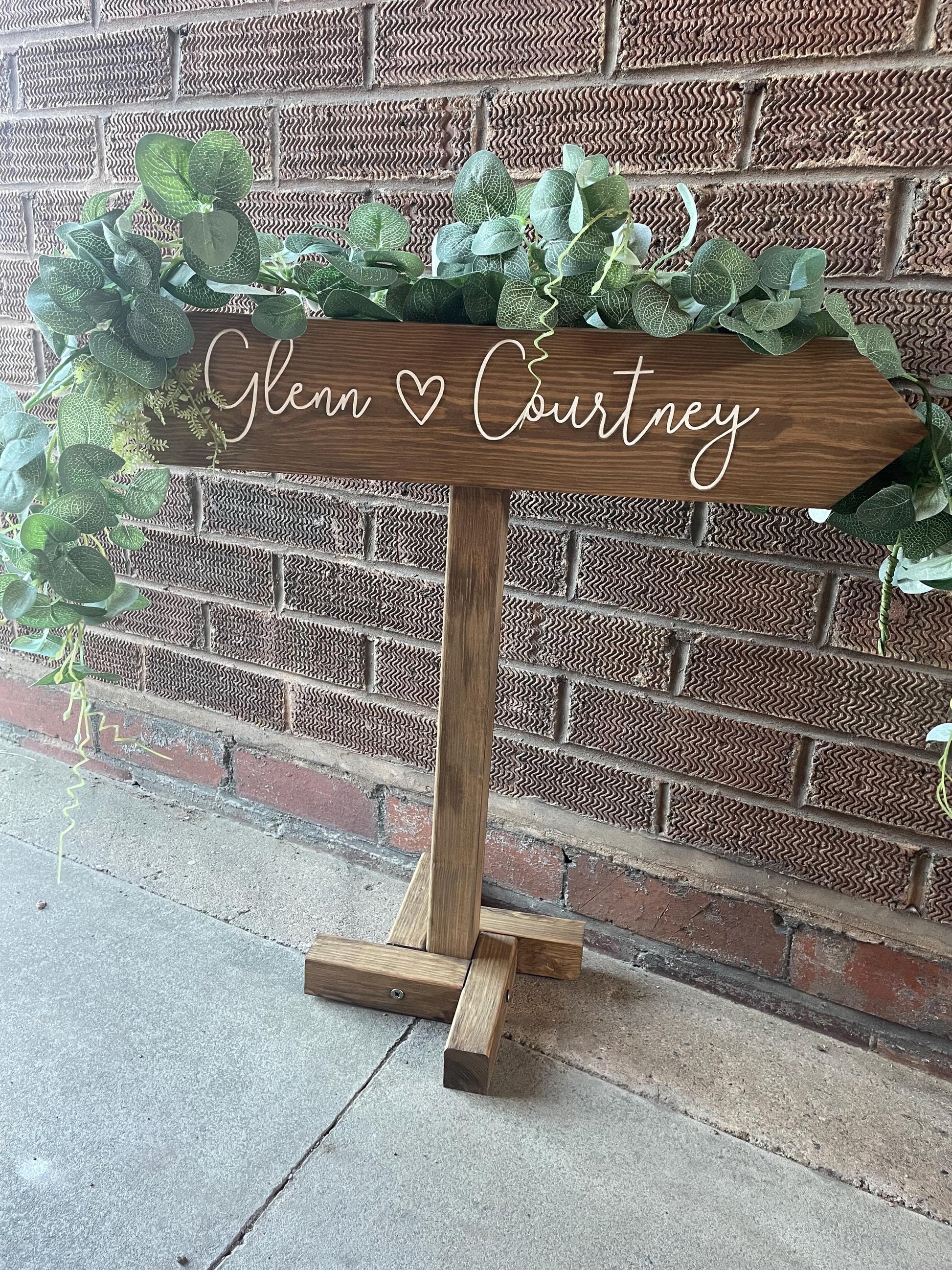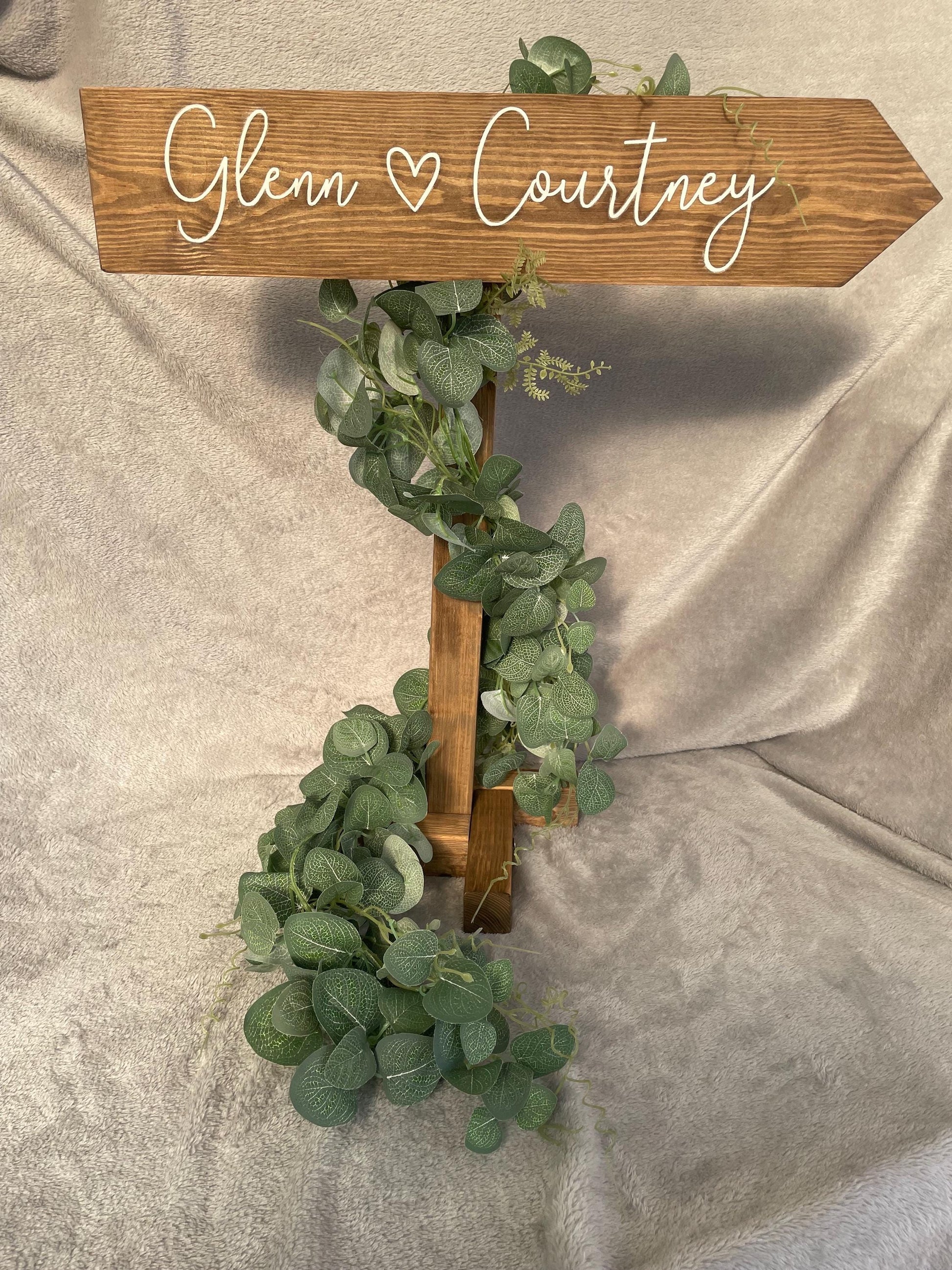 The sign has a 60cm tall stake which slots into the freestanding base meaning the sign can be used in a variety of locations and as a keepsake for the garden after the wedding. It has a pointed arrow sign 50cm x 12cm x 2cm (all measurements are approximate).