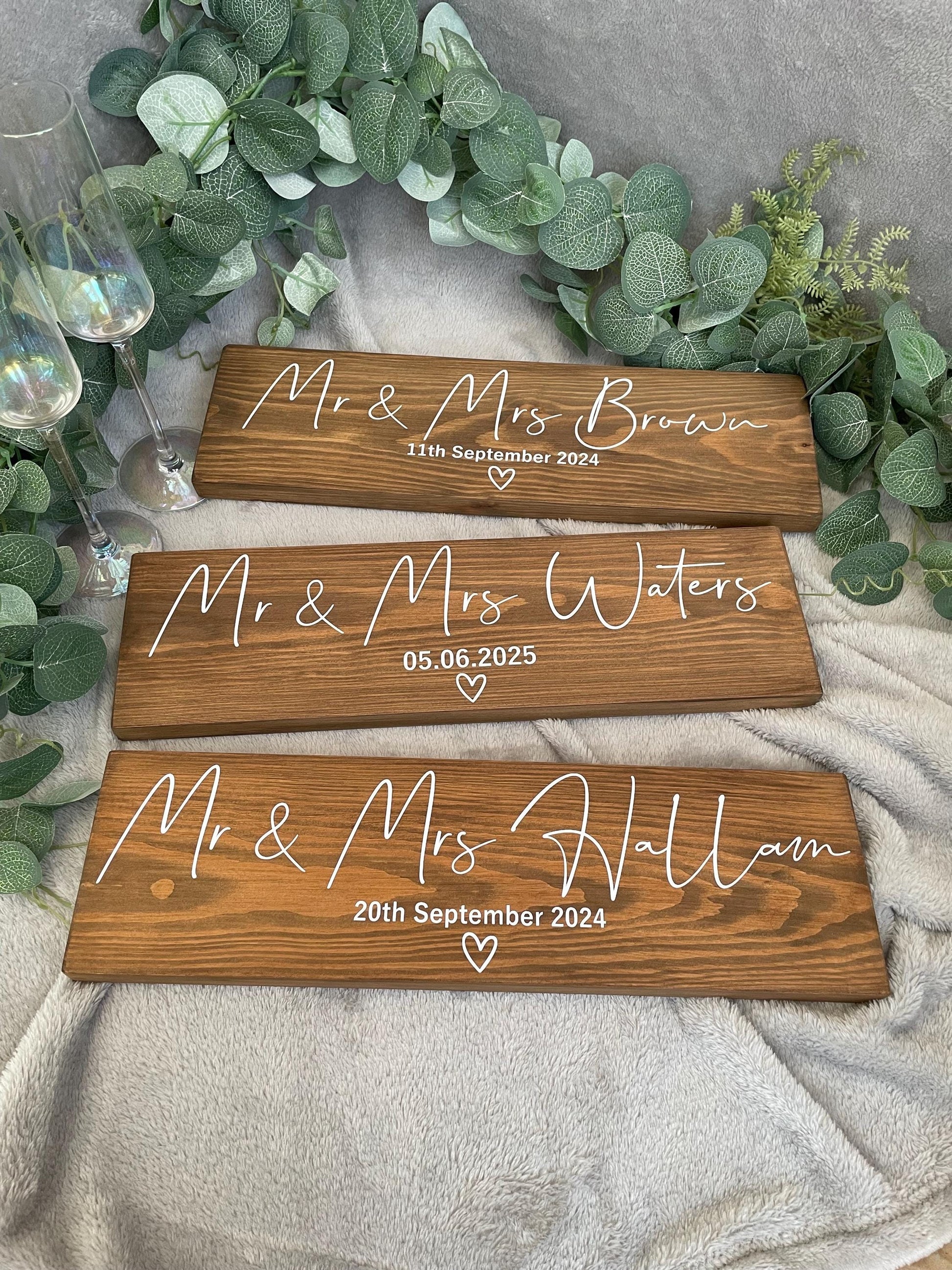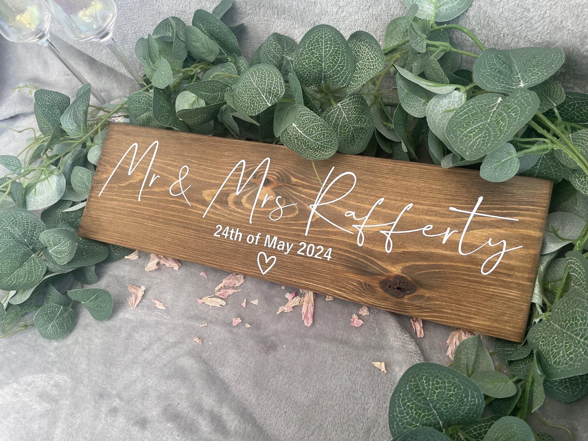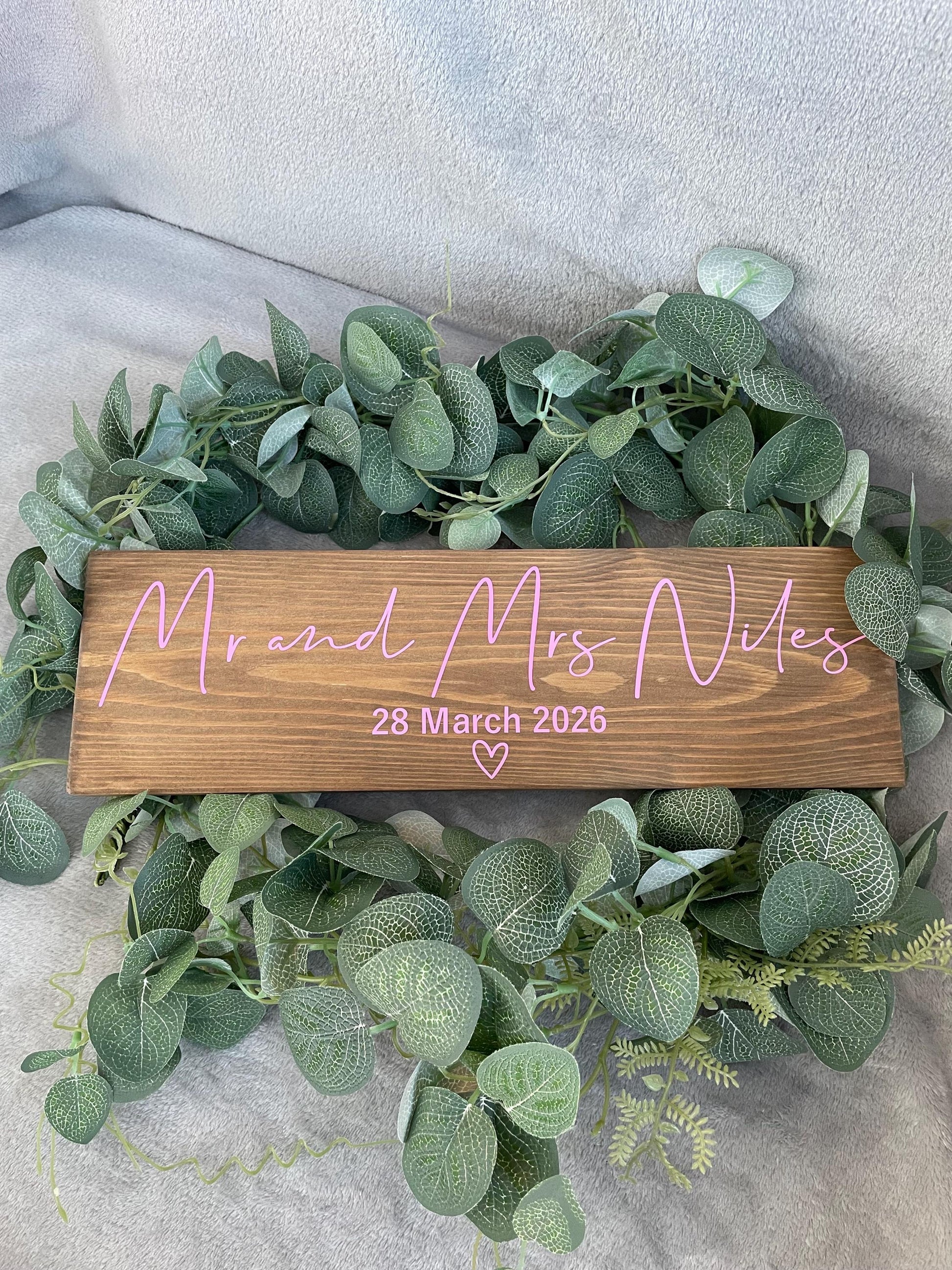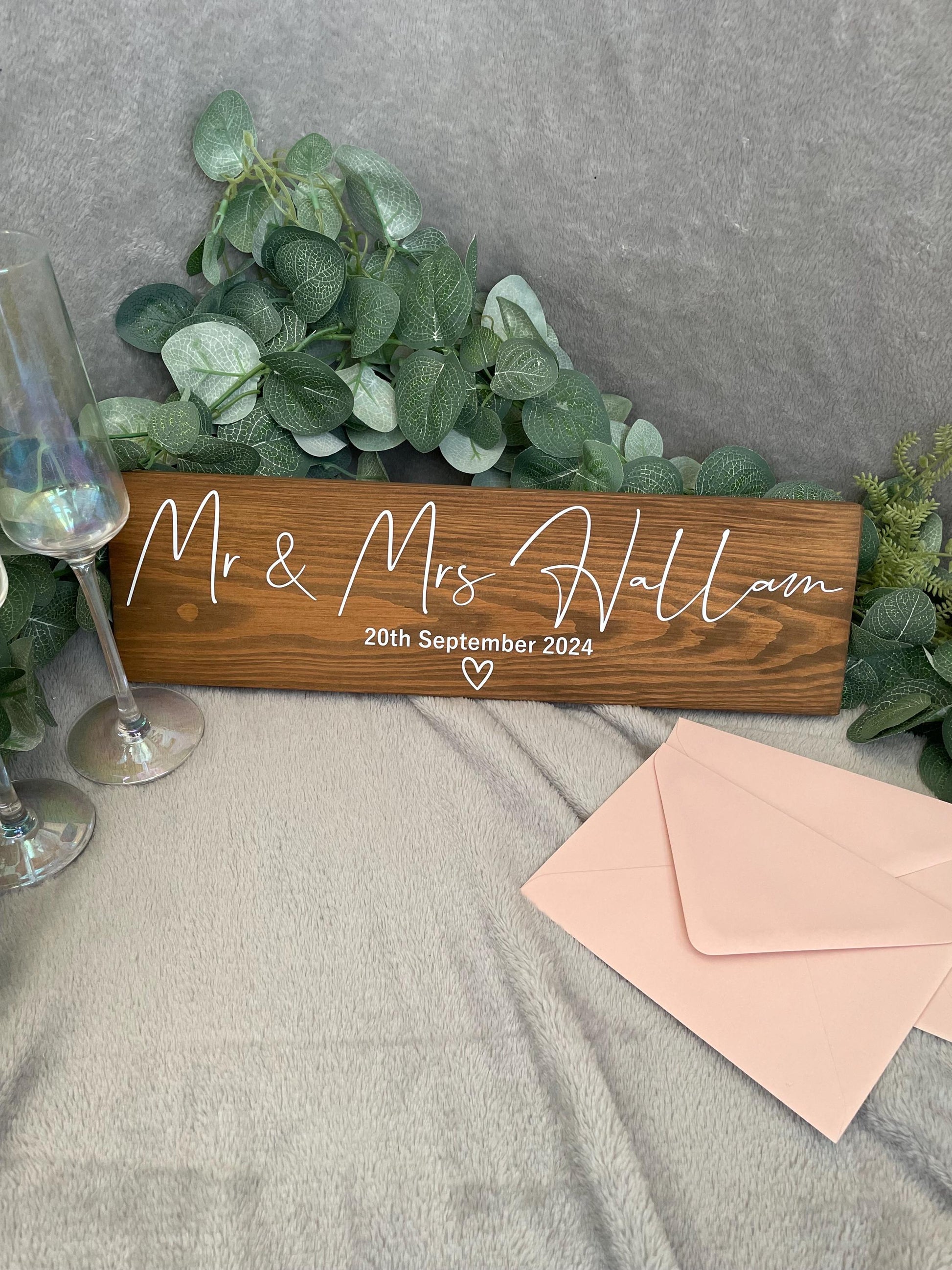 The sign is approx 40cm long x 12cm tall x 2cm deep and includes your chosen titles, surname, date and heart design as standard.