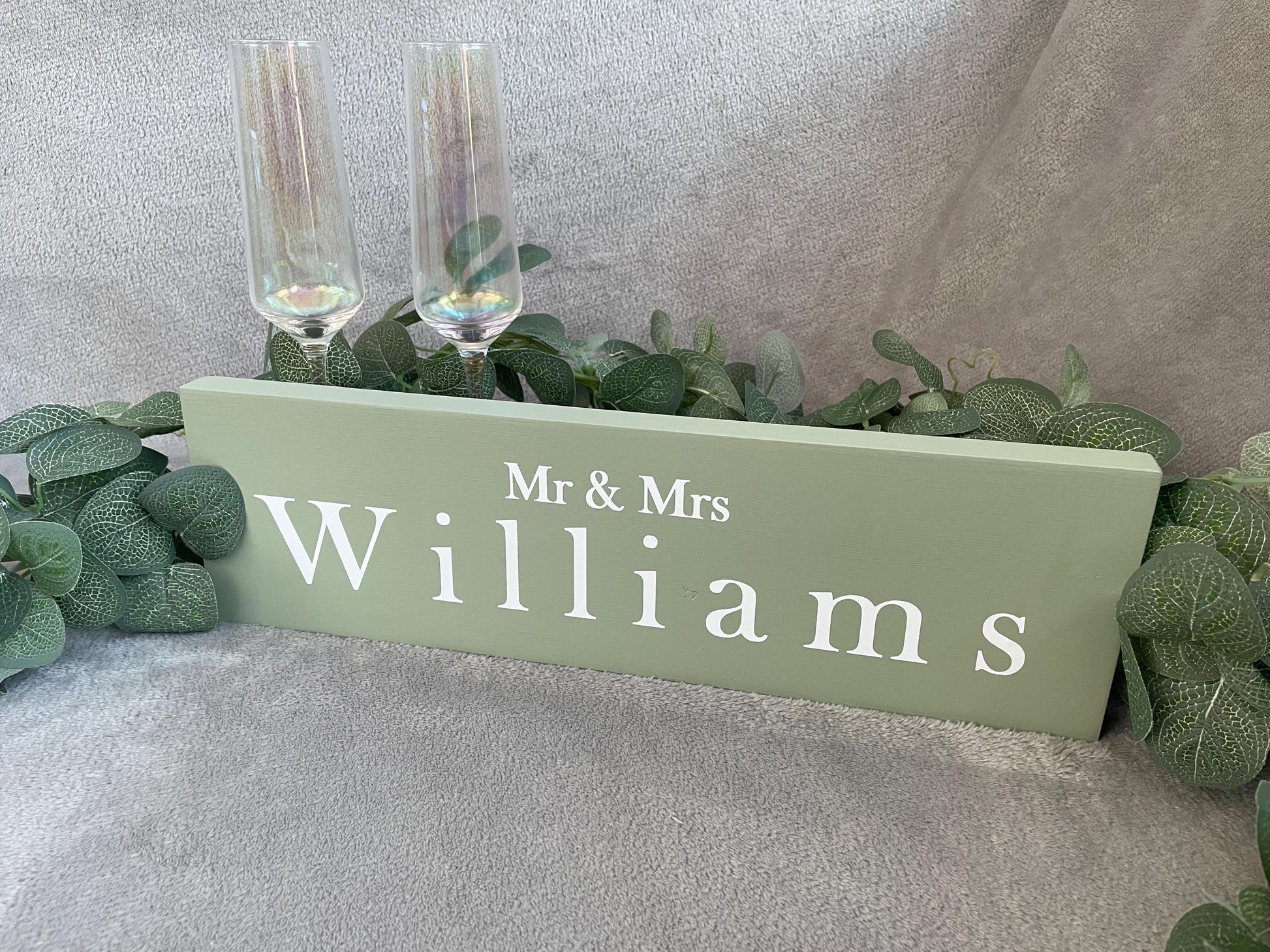 The sign is approx 40cm long x 12cm tall x 2cm deep and includes your chosen titles and surname as standard.