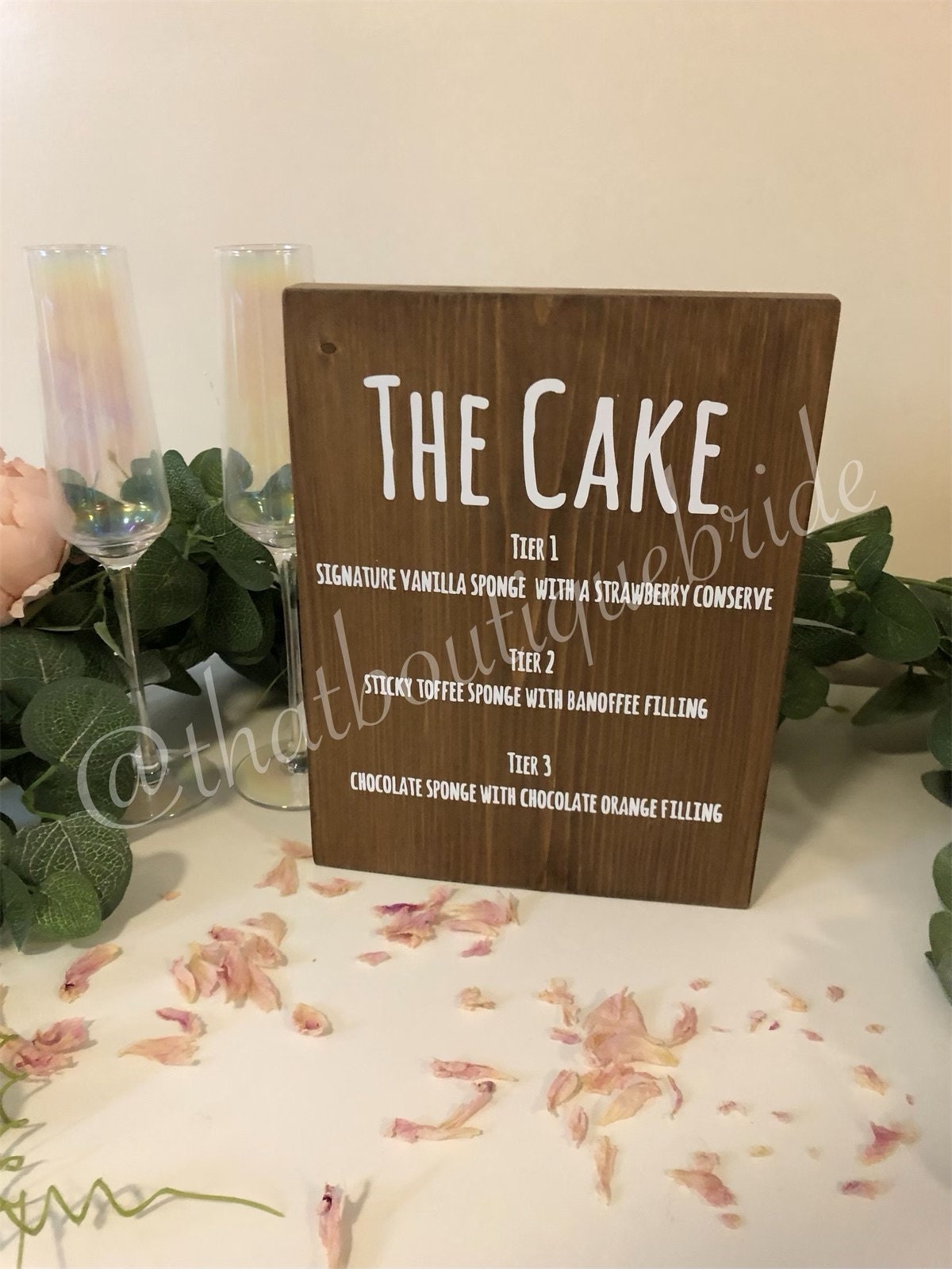 The sign is approx 15cm wide x 21cm tall x 2cm deep with two triangle feet on the reverse. Please note the sign will be reclining back slightly. I do accept custom orders so if you would like a different font please see my other listings and send me a message. The sign is fully customisable and I can also incorporate a cake outline too if preferred.