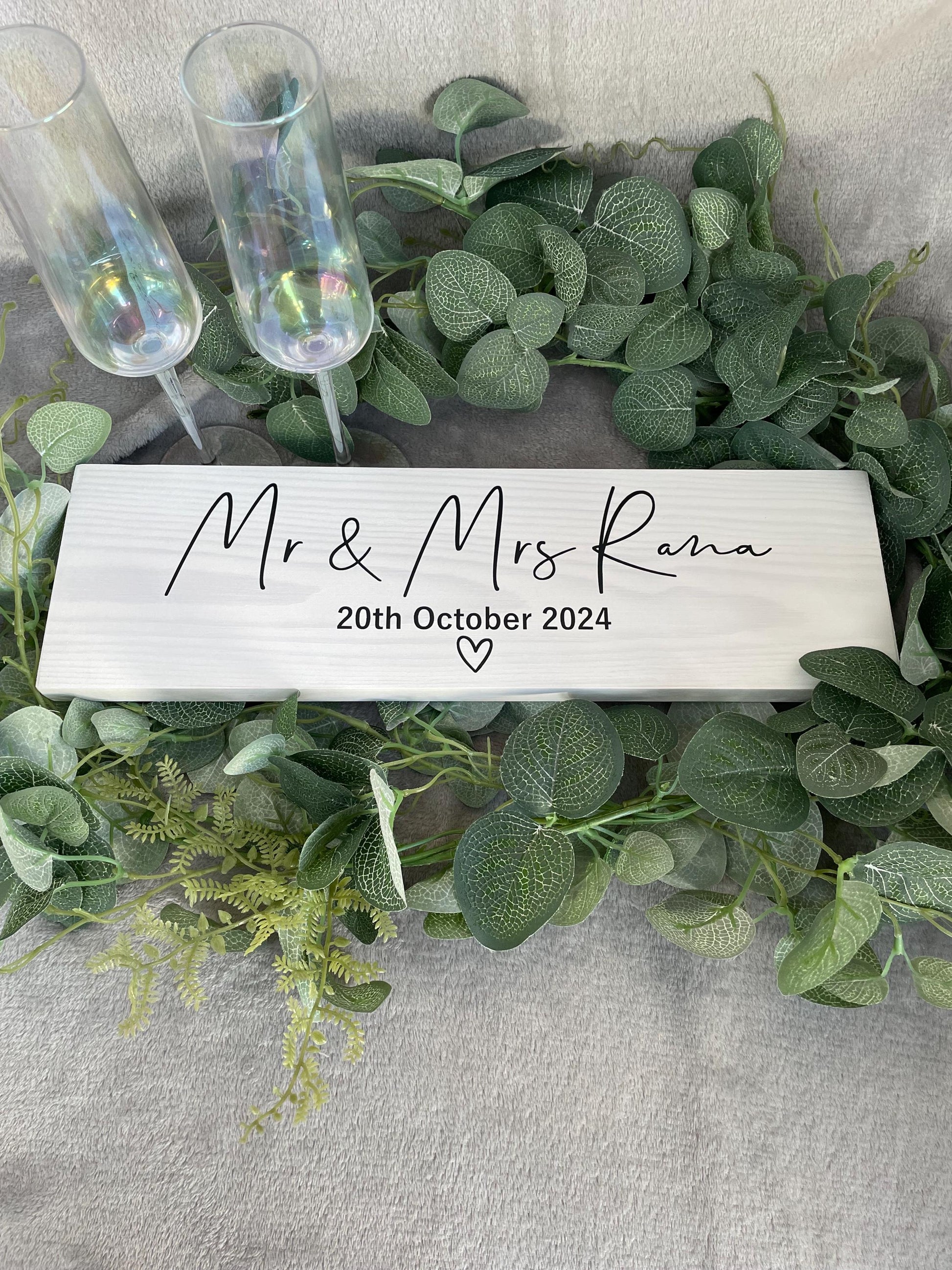 The sign is approx 40cm long x 12cm tall x 2cm deep and includes your chosen titles, surname, date and heart design as standard.